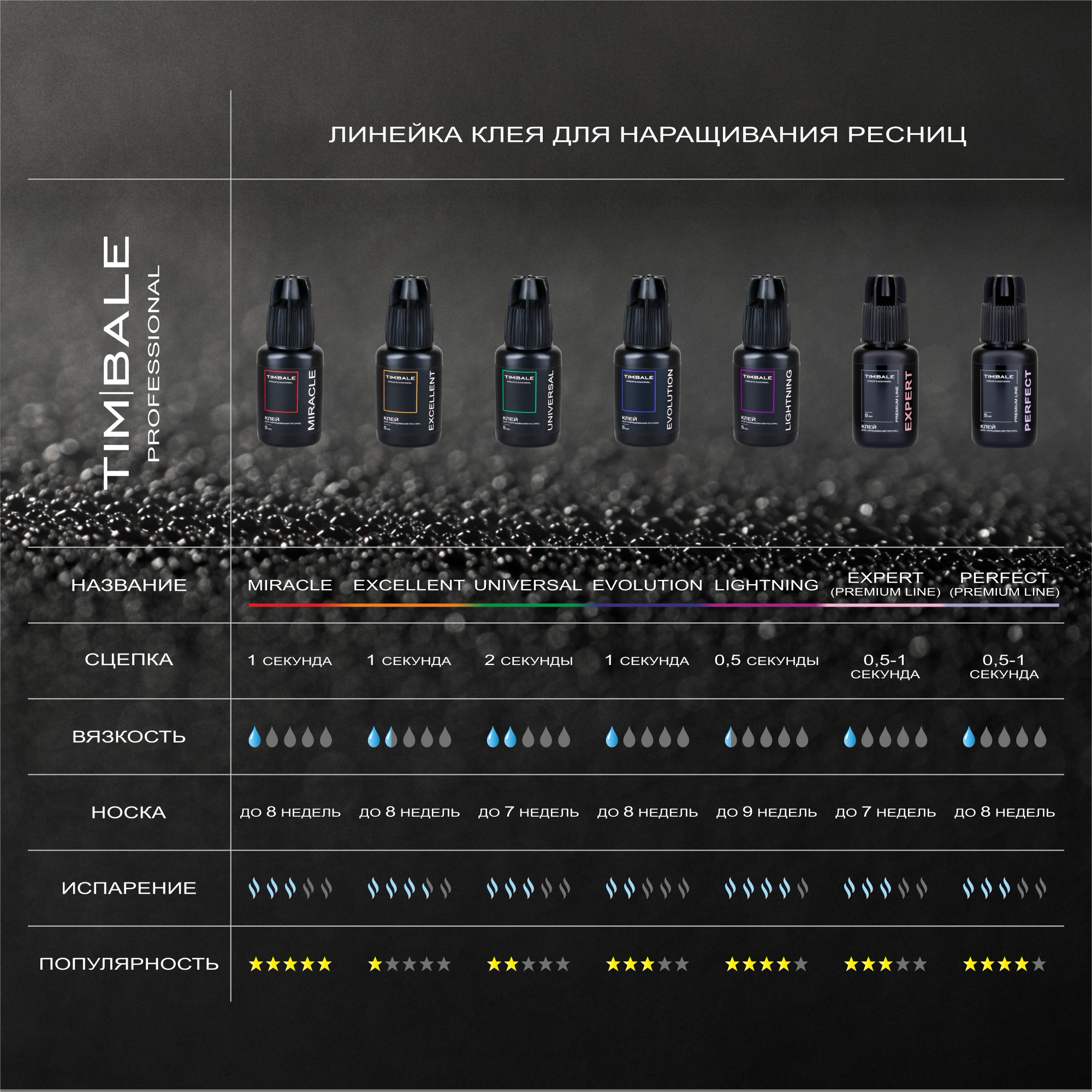 Характеристики приведены сравнительные, т.к. работа клея напрямую зависит от температуры и влажности в помещении во время процедуры наращивания ресниц.