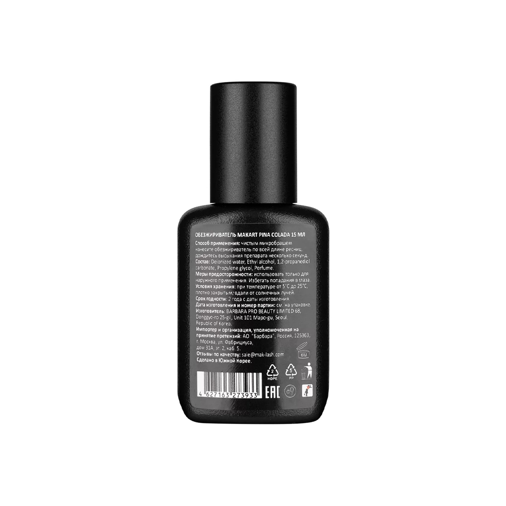 Профессиональный обезжириватель MAKart Pina Colada очищает натуральные ресницы от пыли, грязи, остатков косметики и естественных выделений кожи, а также дарит аромат экзотического ананасового коктейля.